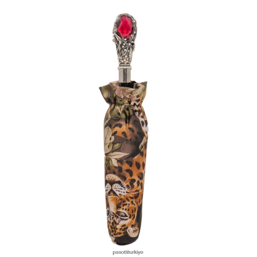 kırmızı taşlı ve kristalli leopar katlanır şemsiye
